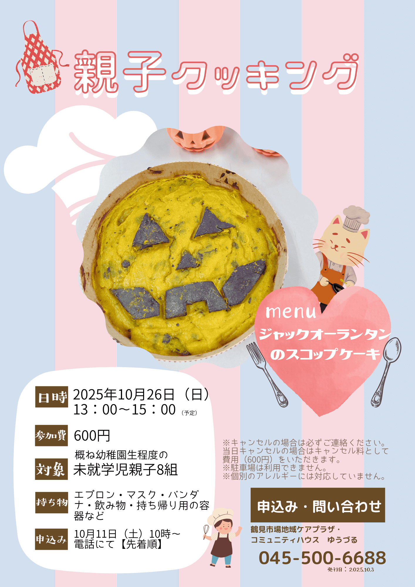 10月の親子クッキングは「ジャックオーランタンのスコップケーキ」を作ります♪ 親子で楽しく作りしましょう☺ ★ゆうづる親子クッキングは親子で料理を楽しむイベントです。 料理教室とは異なりますのでご理解ください。 皆様のご参加をお待ちしております☺