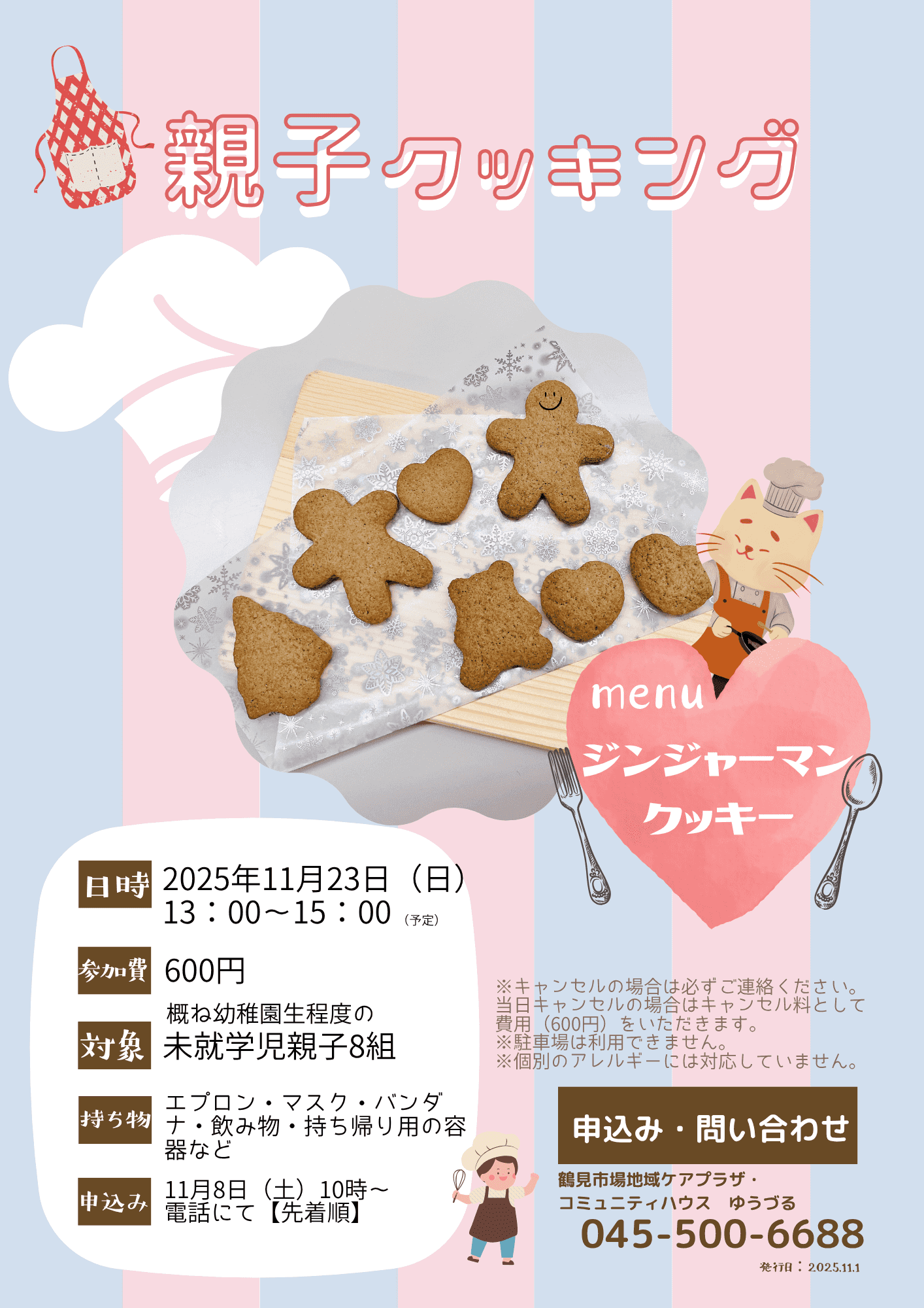 11月の親子クッキングは「ジンジャーマンクッキー」を作ります♪ 親子で楽しく作りしましょう☺ ★ゆうづる親子クッキングは親子で料理を楽しむイベントです。 料理教室とは異なりますのでご理解ください。 皆様のご参加をお待ちしております☺