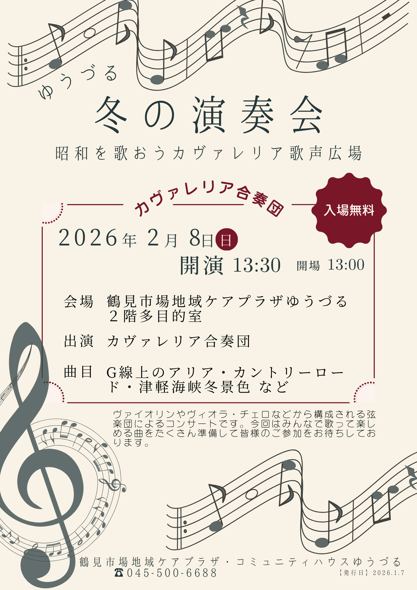 2月8日(日)にヴァイオリン・チェロなど弦楽団から構成されるカヴァレリア合奏団による 冬の演奏会を開催します♬ 今回はクラシックに加え、歌声広場のように生演奏でみんなでうたう歌を多く準備しております。 小さなお子さんから参加できる演奏会です。 お気軽にご参加ください。